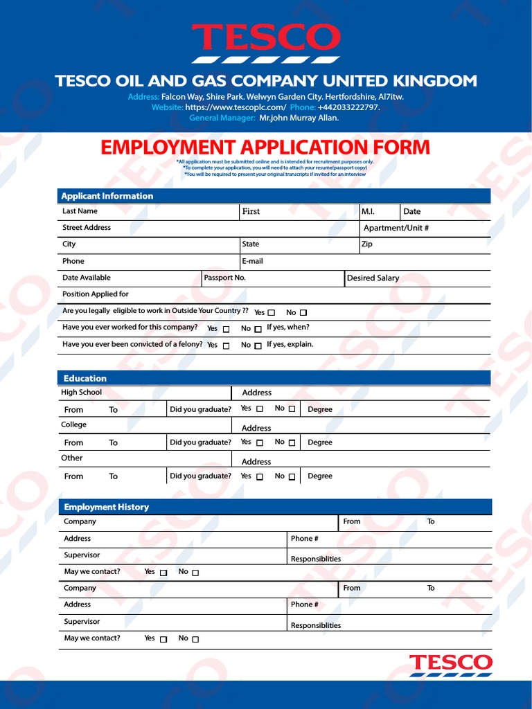 Tesco Job Application Form Free Download