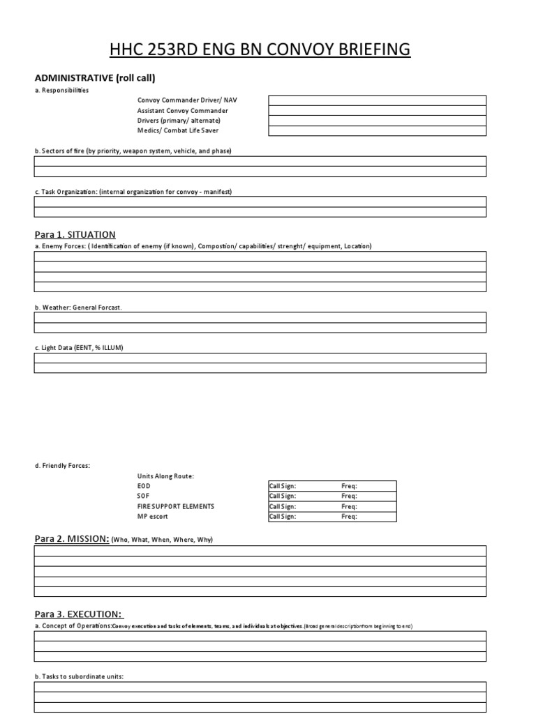 Convoy Brief Template - Edit, sign, and share army convoy brief template online. No need to install software, just go to dochub, and sign up instantly and for free. This pamphlet provides convoy commanders a reference for convoy procedures while operating military vehicles over public. A guide for photographers/videographers/public affairs personnel on how to prepare for and conduct a.