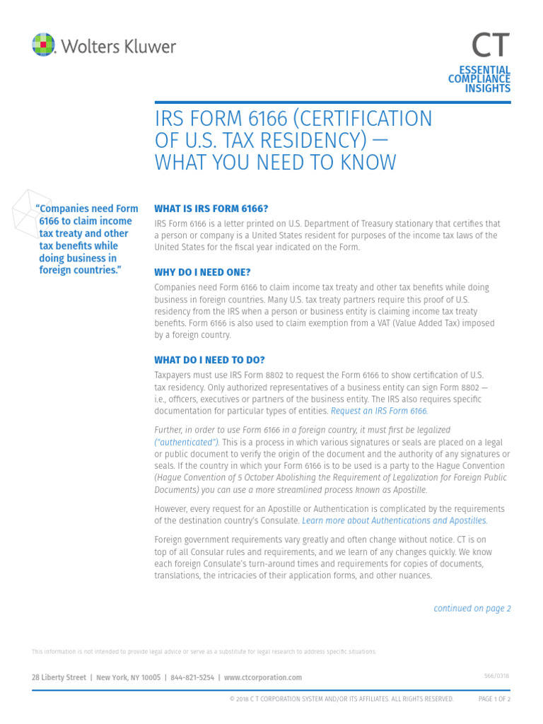 IRS Form 6166, US Tax Residency Wolters Kluwer