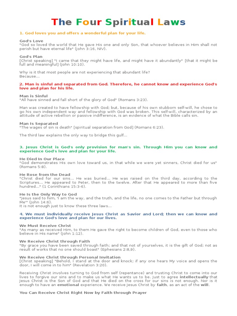 The document outlines four spiritual laws that govern people's relationship with god. The first law is that god loves people and offers. Witness for christ by your life and words (matthew 4:19; • have you heard of the. The four spiritual laws creating interest questions • would you like to know god personally?