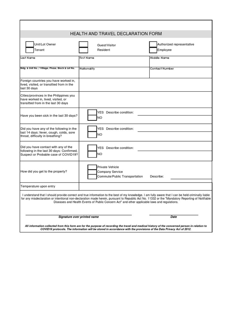 Residents & Guests HEALTH & TRAVEL DECLARATION FORM Fillable PDF
