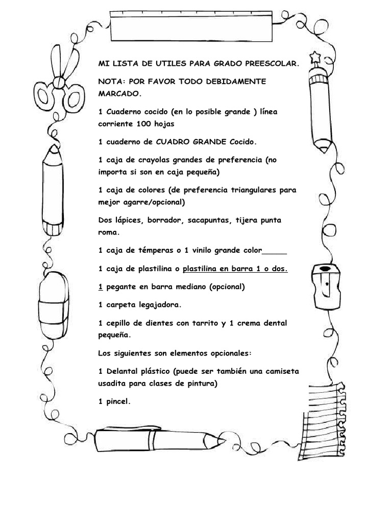 Lista De Utiles Escolares Para Kindergarten - De lápices #2 (24 ct) 6 cajas de crayolas. Lista de útiles para kindergarten ¡gracias de antemano por su apoyo a nuestra clase! Su hijo necesitará lápices, crayones, pegamento y tijeras en la casa para hacer sus tareas. Suficientemente grande como para contener una carpeta de 9x12 (que la maestra proporcionará),.