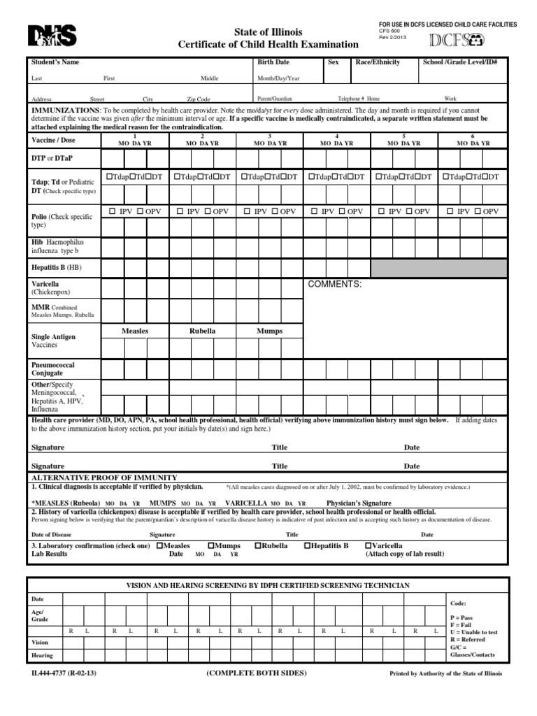 DHS CFS 600 Certificate of Child Examination Form IL4444737 Vaccines
