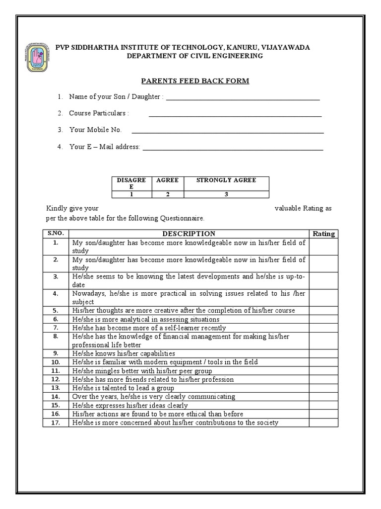 Parents Feed Back Form PVP Siddhartha Institute of Technology, Kanuru