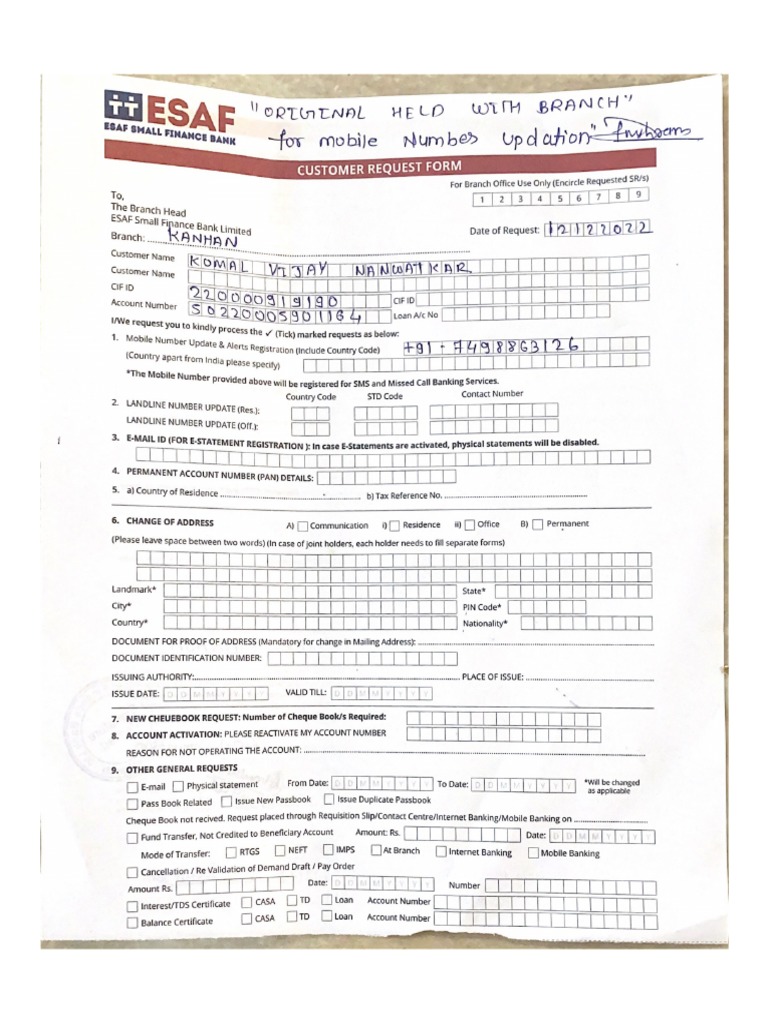 Customer Request Form Sbi PDF Download PDF