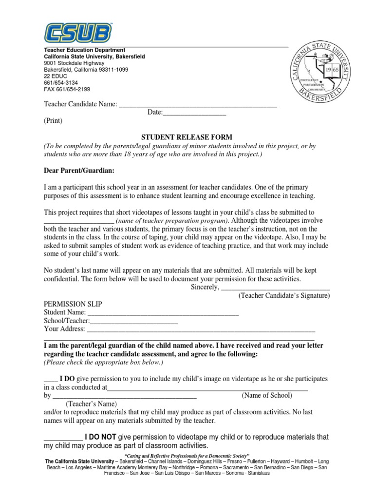 Student Release Form PDF Teachers Learning
