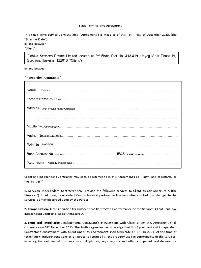 Fixed Term Service Agreement 7days PDF Indemnity Business